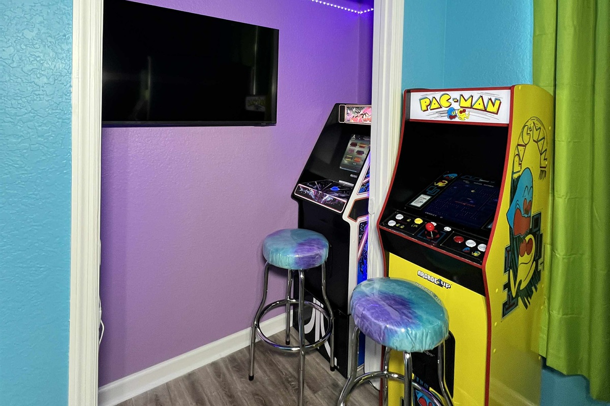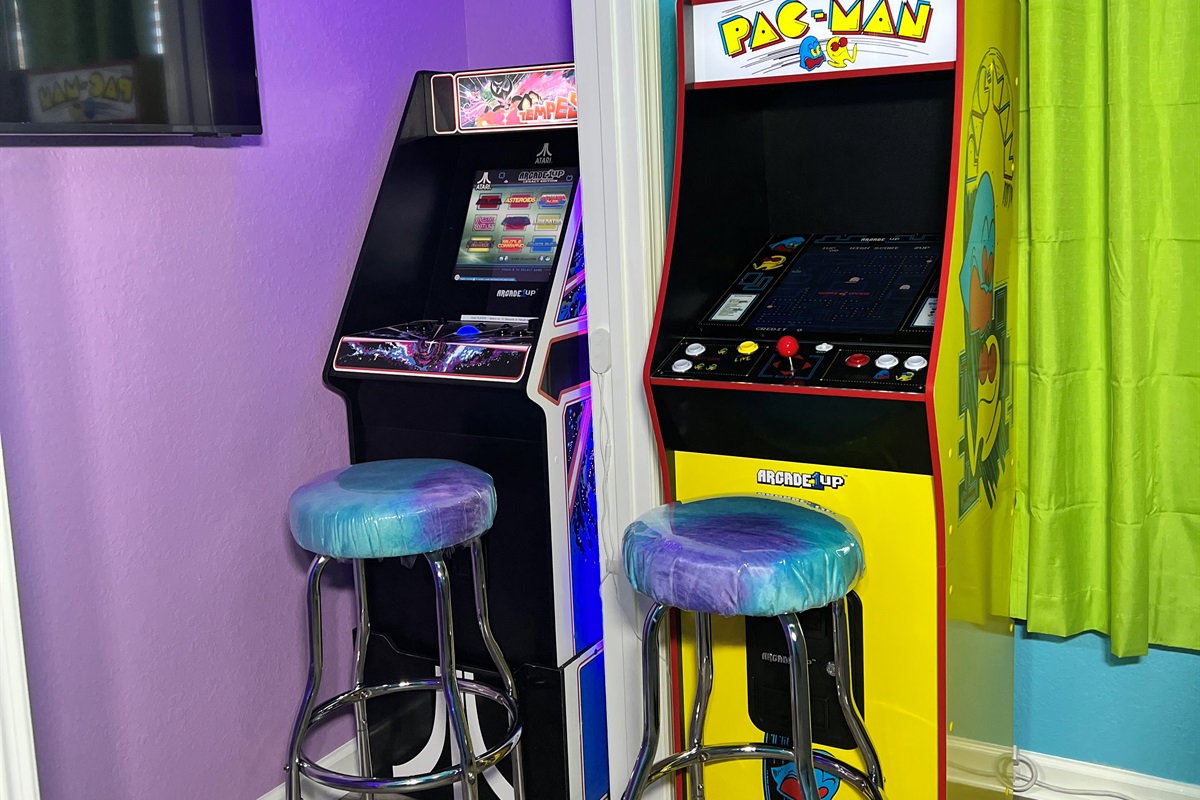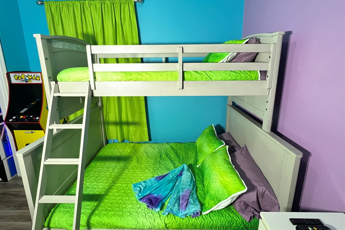 The entire Monster Home is gently themed with Monster accents throughout. Our immersive Monsters Inc themed kids room will thrill the young and old alike! Complete with family arcade style fun, Pac-man and Millipede arcade games will provide hours of laughs and enjoyment.
